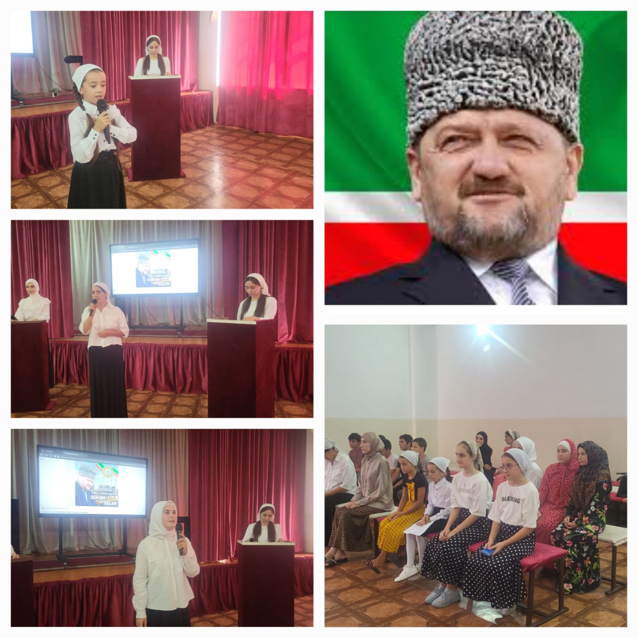 Учащиеся приняли участие в просмотре видео-фильма "Ушел непобежденным" — о подвиге Ахмат-Хаджи Кадырова во имя спасения своего народа и его будущего. Участники мероприятия прочитали, призывая чтить и помнить великий подвиг этого человека.